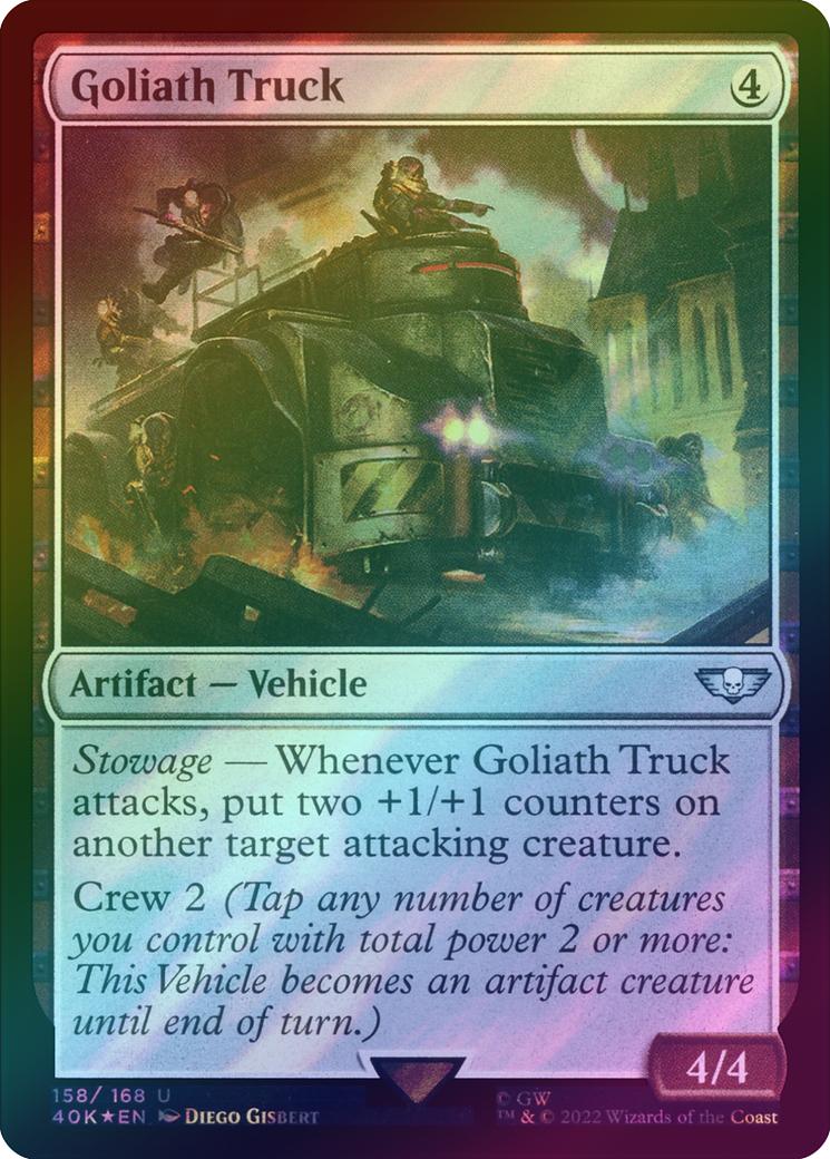 Goliath TruckCasting Cost: Card Type: Artifact - VehiclePower/Toughness: 4/4Card Text: Stowage - Whenever this Vehicle attacks, put two +1/+1 counters on another target attacking creature. Crew 2 (Tap any number of creatures you control with total power 2 or more: This Vehicle becomes an artifact creature until end of turn.)Artist: Diego Gisbert