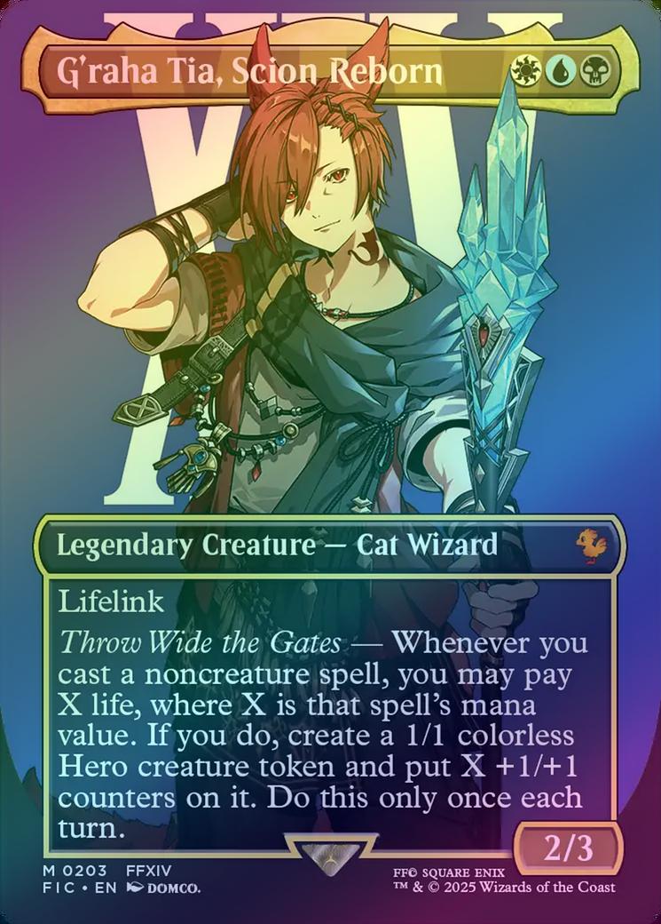 G'raha Tia, Scion RebornCasting Cost: Card Type: Legendary Creature - Cat WizardPower/Toughness: 2/3Card Text: Lifelink Throw Wide the Gates - Whenever you cast a noncreature spell, you may pay X life, where X is that spell's mana value. If you do, create a 1/1 colorless Hero creature token and put X +1/+1 counters on it. Do this only once each turn.Artist: Domco.