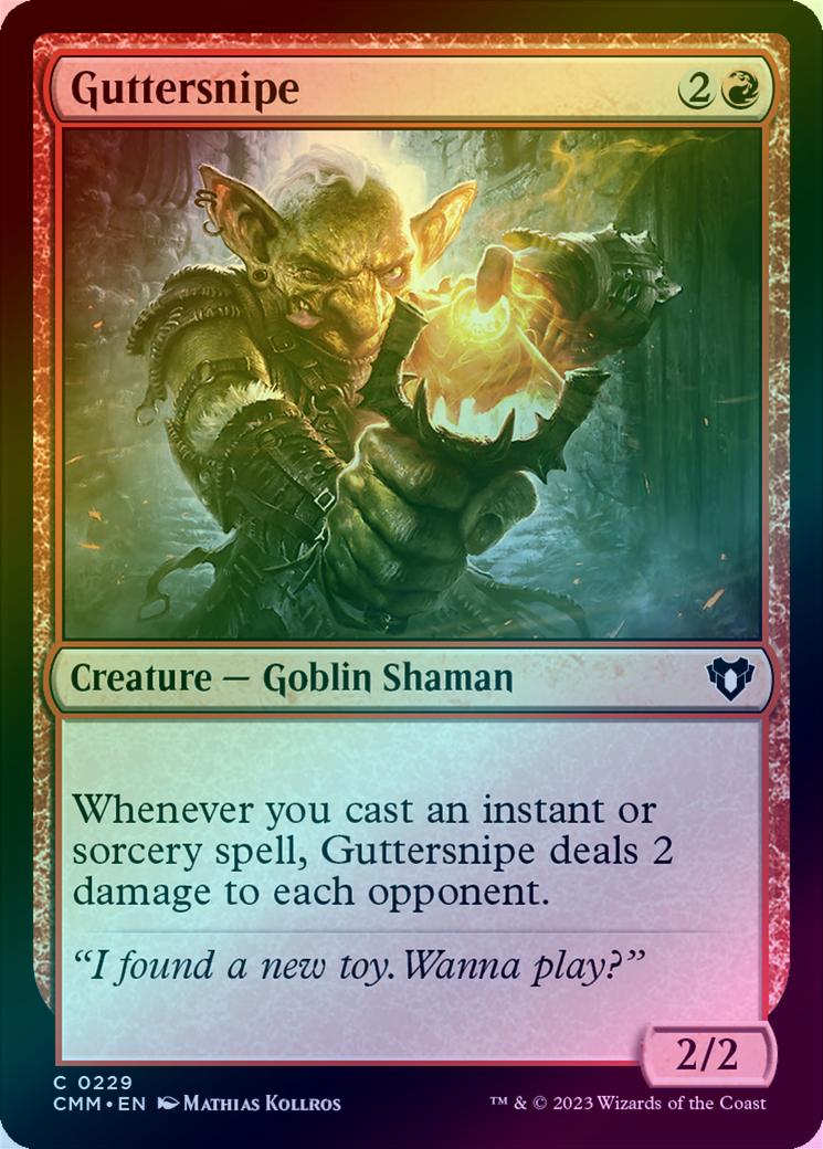 GuttersnipeCasting Cost: Card Type: Creature - Goblin ShamanPower/Toughness: 2/2Card Text: Whenever you cast an instant or sorcery spell, Guttersnipe deals 2 damage to each opponent.Flavour Text: "I found a new toy. Wanna play?"Artist: Mathias Kollros