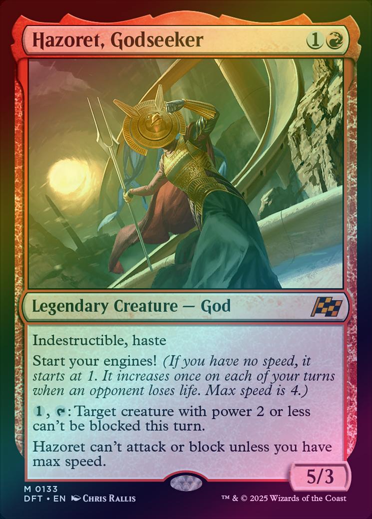 Hazoret, GodseekerCasting Cost: Card Type: Legendary Creature - GodPower/Toughness: 5/3Card Text: Indestructible, haste Start your engines! (If you have no speed, it starts at 1. It increases once on each of your turns when an opponent loses life. Max speed is 4.) , : Target creature with power 2 or less can't be blocked this turn. Hazoret can't attack or block unless you have max speed.Artist: Chris Rallis