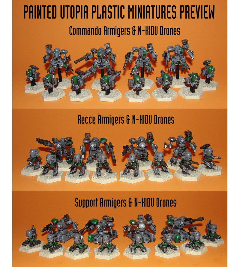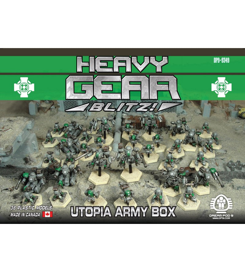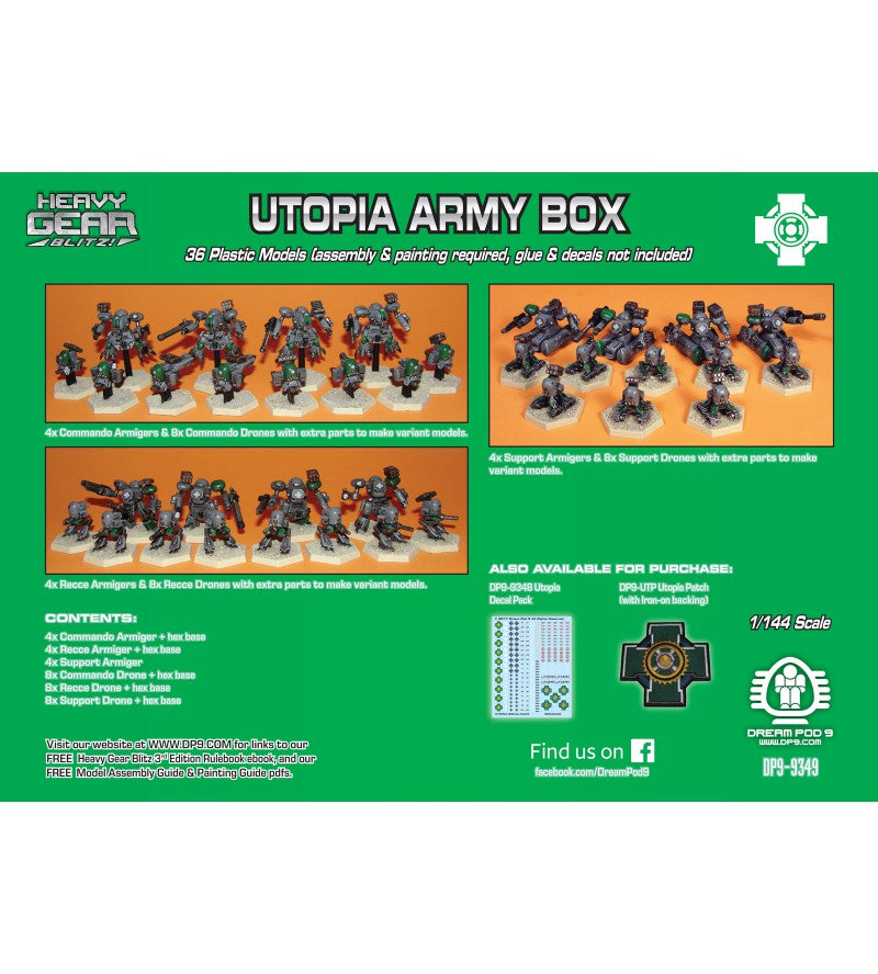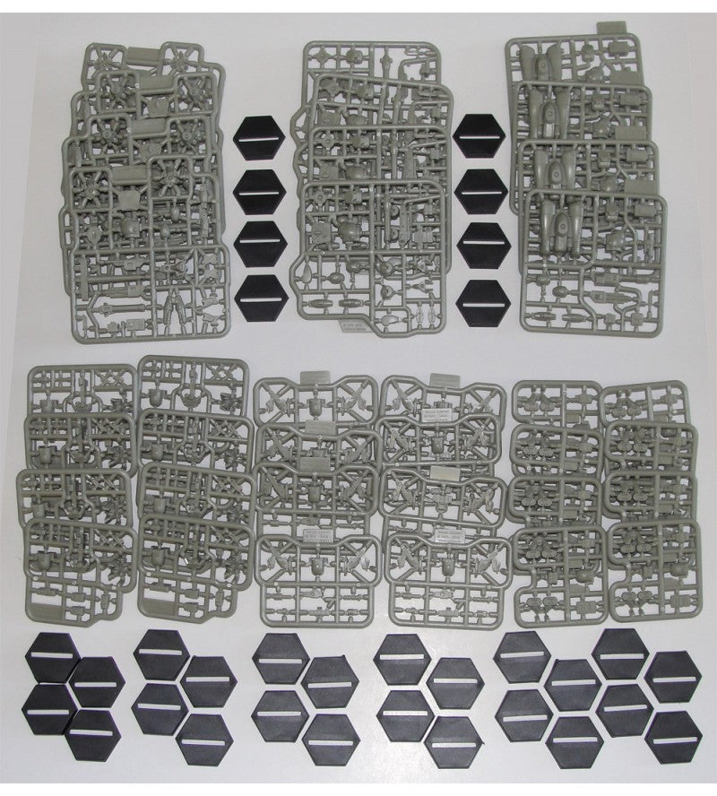 Utopia Plastic Miniatures Army includes 36 plastic miniatures with lots of extra weapons and parts on the sprues, plus black plastic hex or round bases. Painting and Assembly Required, decals not included.