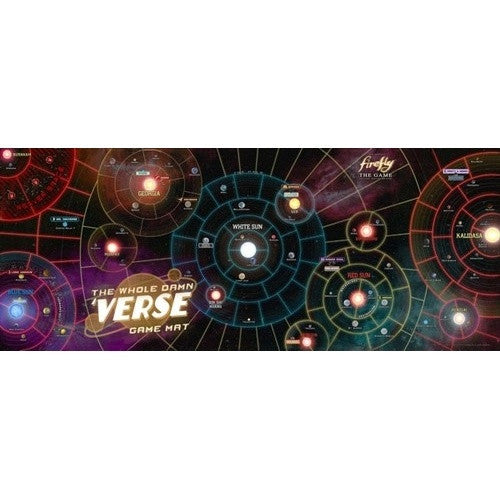 Navigate the complete ‘Verse with the Firefly: The Game – The Whole Damn 'Verse vinyl game mat. Full Burn from the thriving Core Worlds of Alliance Space to the farthest reaches of Rim Space. This comprehensive 50" x 20" game mat includes the planetary systems of Firefly: The Game and both its Rim Space Expansions, Blue Sun and Kalidasa.