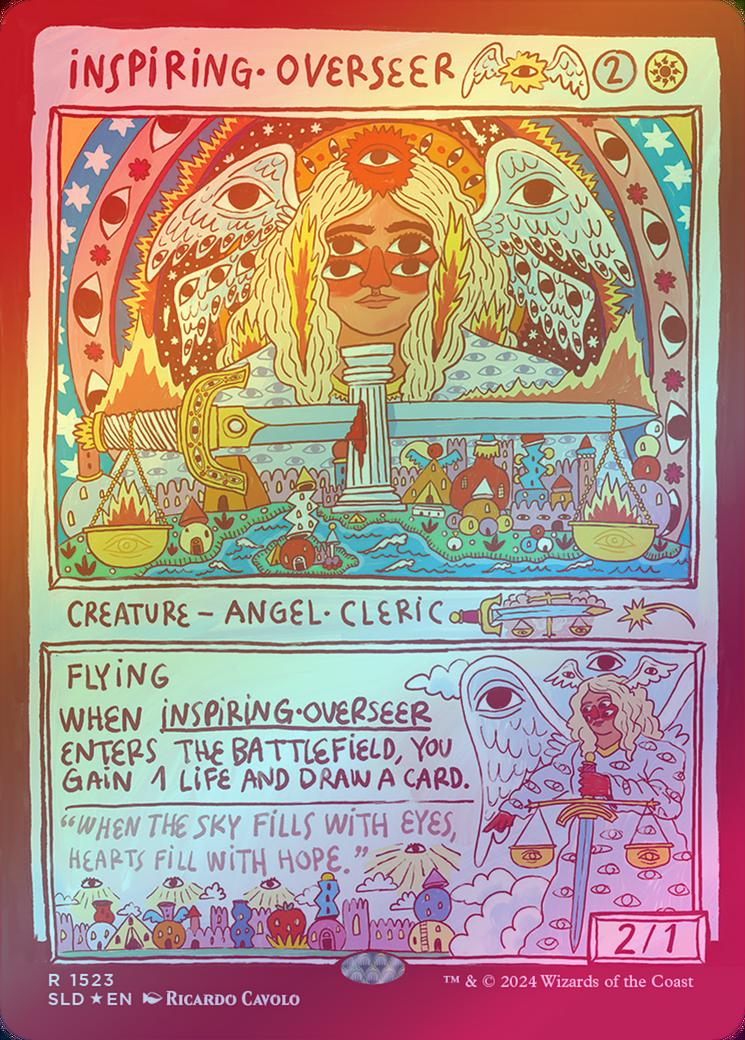 Inspiring OverseerCasting Cost: Card Type: Creature - Angel ClericPower/Toughness: 2/1Card Text: Flying When Inspiring Overseer enters the battlefield, you gain 1 life and draw a card.Flavour Text: "WHEN THE SKY FILLS WITH EYES, HEARTS FILL WITH HOPE."Artist: Ricardo Cavolo