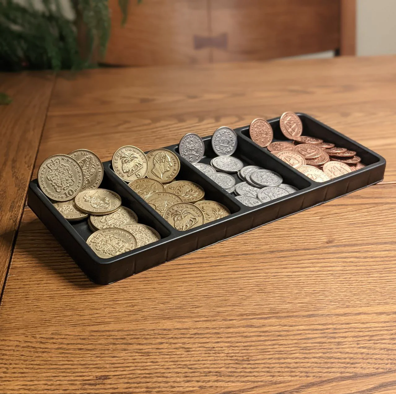 Add-on for John Company: Second Edition. 90 metal coins in 4 denominations of different size and thickness (40 £1 coins, 20 £2 coins, 20 £5 coins, and 10 £10 coins) NOTE: Plastic tray not included with this item and is included in John Company: Second edition.