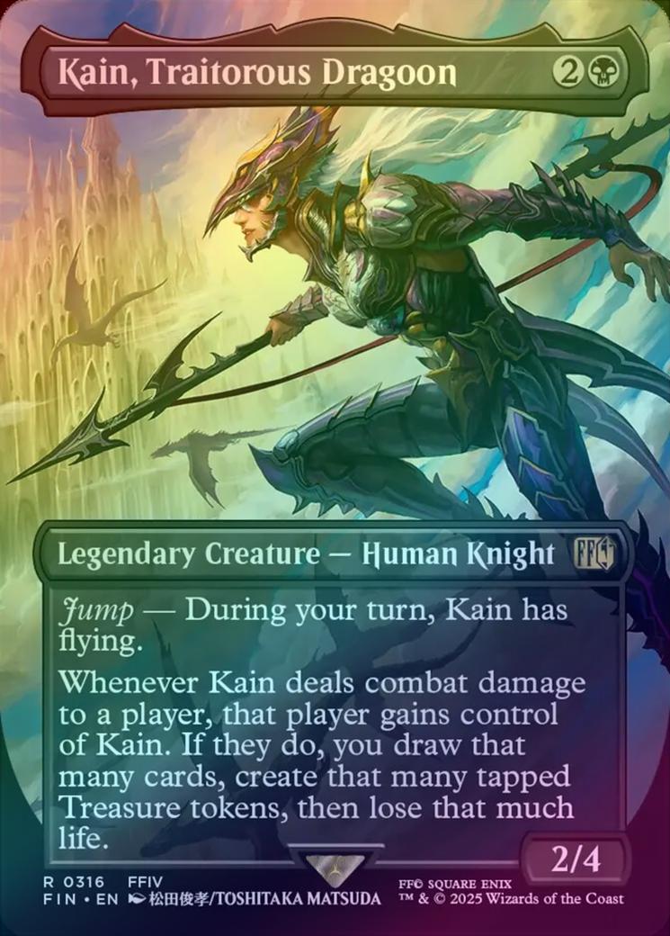 Kain, Traitorous DragoonCasting Cost: Card Type: Legendary Creature - Human KnightPower/Toughness: 2/4Card Text: Jump - During your turn, Kain has flying. Whenever Kain deals combat damage to a player, that player gains control of Kain. If they do, you draw that many cards, create that many tapped Treasure tokens, then lose that much life.Artist: Toshitaka Matsuda