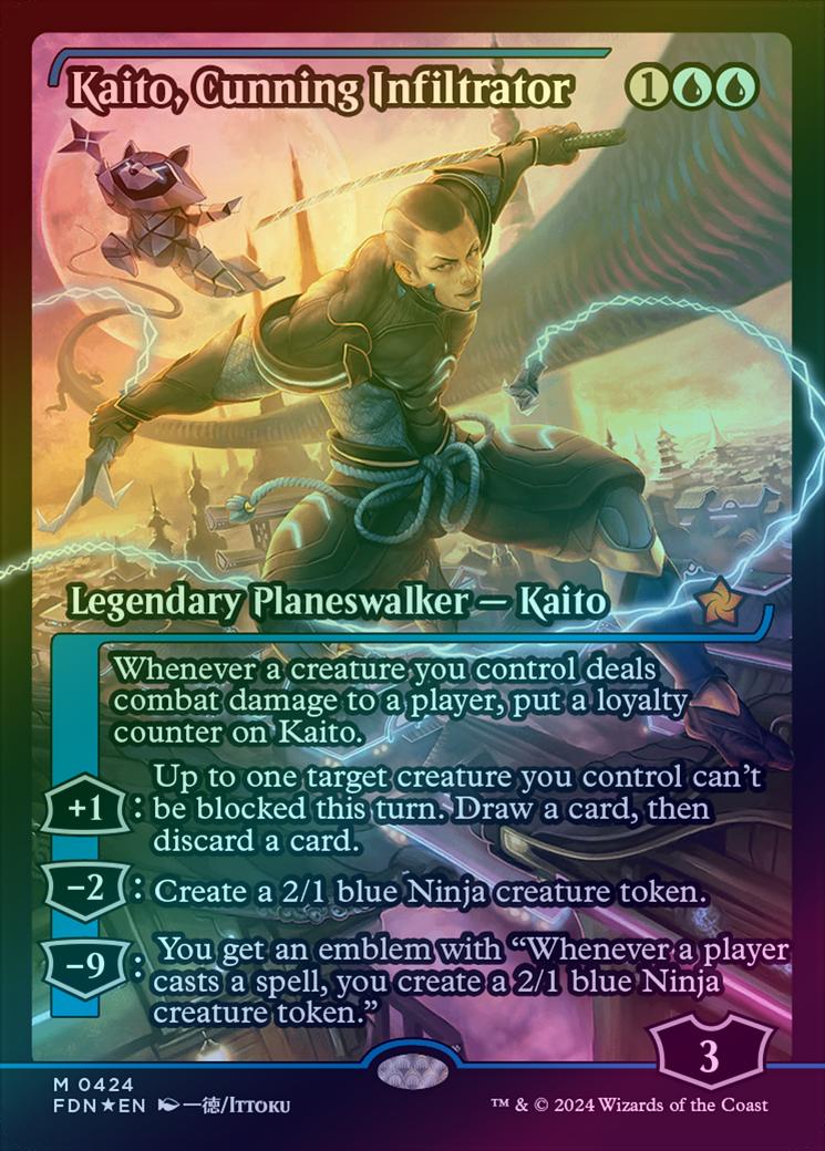 Kaito, Cunning InfiltratorCasting Cost: Card Type: Legendary Planeswalker - KaitoLoyalty: 3Card Text: Whenever a creature you control deals combat damage to a player, put a loyalty counter on Kaito. +1: Up to one target creature you control can't be blocked this turn. Draw a card, then discard a card. -2: Create a 2/1 blue Ninja creature token. -9: You get an emblem with "Whenever a player casts a spell, you create a 2/1 blue Ninja creature token."Artist: Ittoku