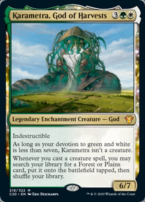 Karametra, God of HarvestsCasting Cost: Card Type: Legendary Enchantment Creature - GodPower/Toughness: 6/7Card Text: Indestructible As long as your devotion to green and white is less than seven, Karametra isn't a creature. Whenever you cast a creature spell, you may search your library for a Forest or Plains card, put it onto the battlefield tapped, then shuffle your library.Artist: Eric DeschampsRarity: Mythic