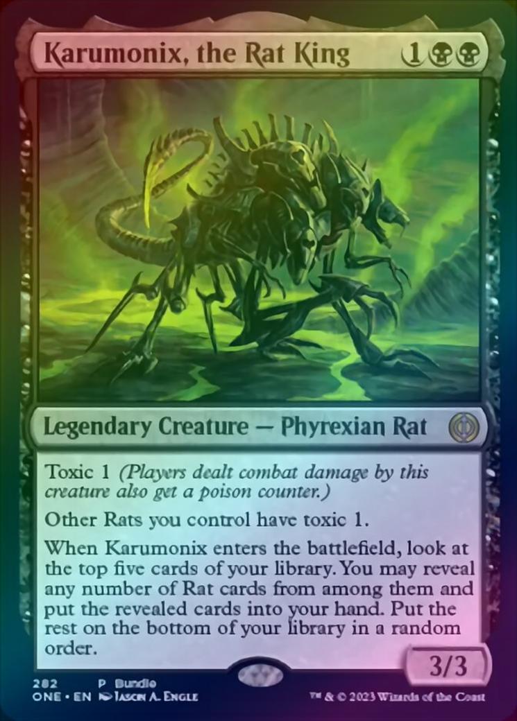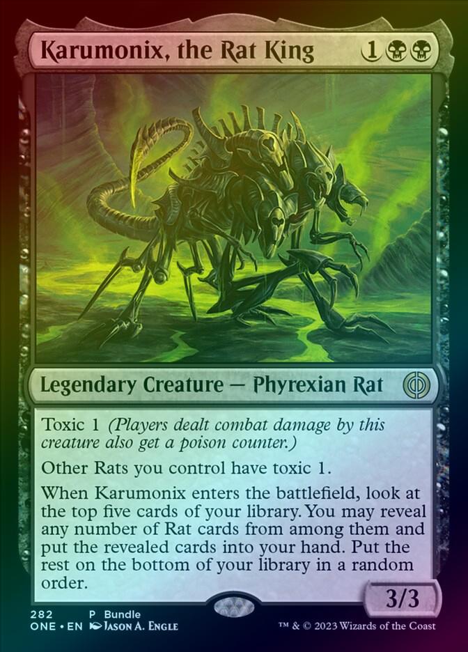 Karumonix, the Rat KingCasting Cost: Card Type: Legendary Creature - Phyrexian RatPower/Toughness: 3/3Card Text: Toxic 1 (Players dealt combat damage by this creature also get a poison counter.) Other Rats you control have toxic 1. When Karumonix enters the battlefield, look at the top five cards of your library. You may reveal any number of Rat cards from among them and put the revealed cards into your hand. Put the rest on the bottom of your library in a random order.Artist: Jason A. Engle