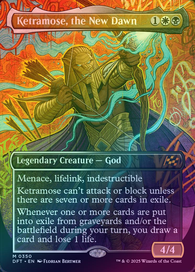 Ketramose, the New DawnCasting Cost: Card Type: Legendary Creature - GodPower/Toughness: 4/4Card Text: Menace, lifelink, indestructible Ketramose can't attack or block unless there are seven or more cards in exile. Whenever one or more cards are put into exile from graveyards and/or the battlefield during your turn, you draw a card and lose 1 life.Artist: Florian Bertmer