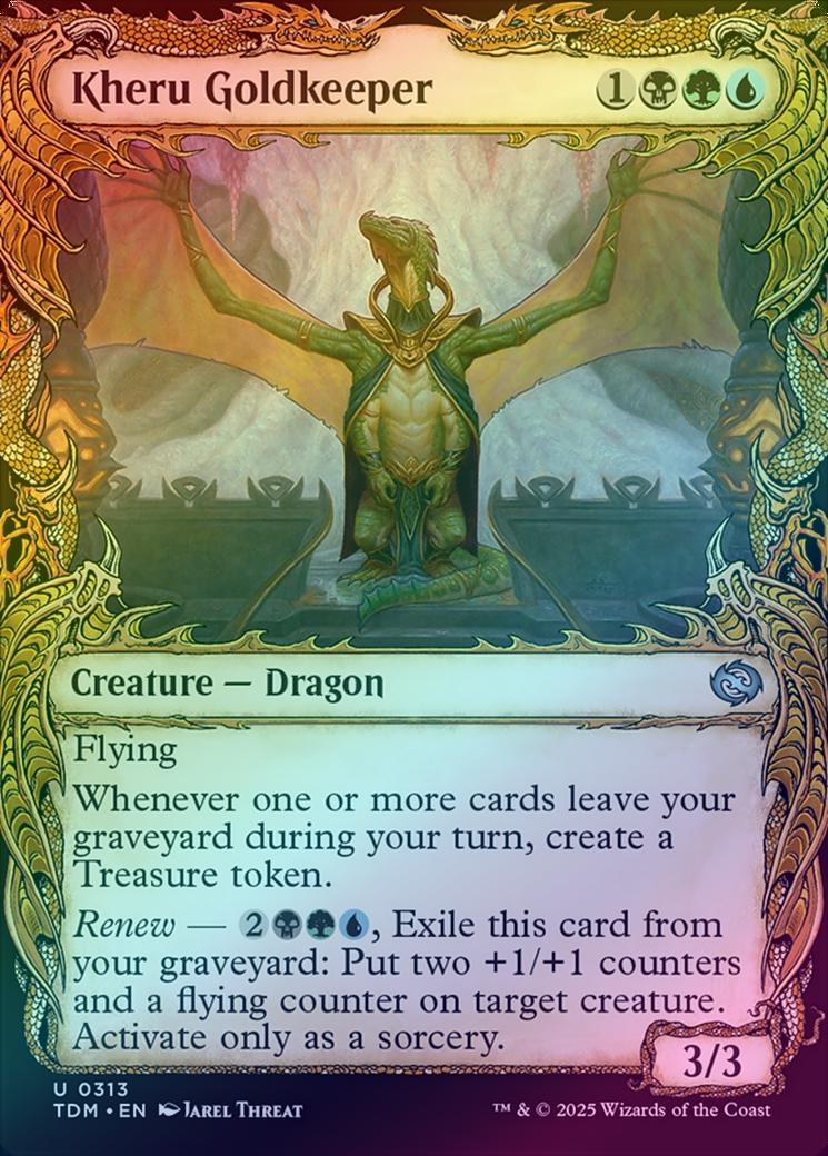 Kheru GoldkeeperCasting Cost: Card Type: Creature - DragonPower/Toughness: 3/3Card Text: Flying Whenever one or more cards leave your graveyard during your turn, create a Treasure token. (It's an artifact with ", Sacrifice this token: Add one mana of any color.") Renew - , Exile this card from your graveyard: Put two +1/+1 counters and a flying counter on target creature. Activate only as a sorcery.