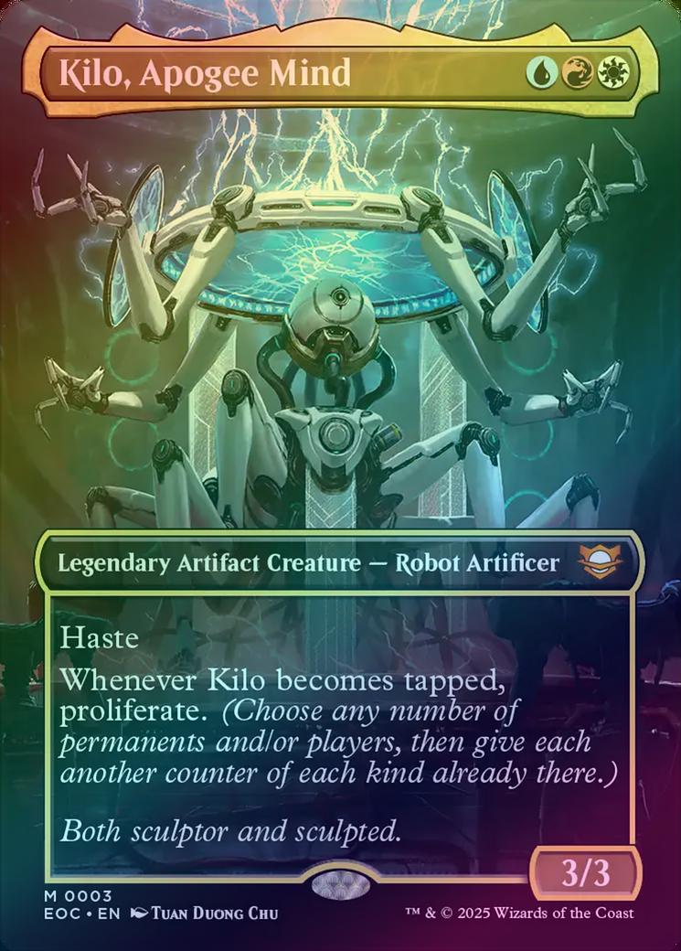 Kilo, Apogee MindCasting Cost: Card Type: Legendary Artifact Creature - Robot ArtificerPower/Toughness: 3/3Card Text: Haste Whenever Kilo becomes tapped, proliferate. (Choose any number of permanents and/or players, then give each another counter of each kind already there.)Flavour Text: Both sculptor and sculpted.Artist: Tuan Duong Chu