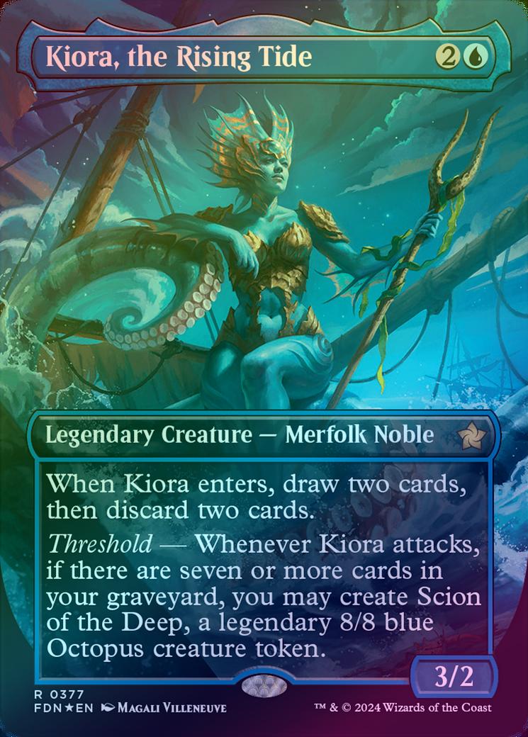 Kiora, the Rising TideCasting Cost: Card Type: Legendary Creature - Merfolk NoblePower/Toughness: 3/2Card Text: When Kiora enters, draw two cards, then discard two cards. Threshold - Whenever Kiora attacks, if there are seven or more cards in your graveyard, you may create Scion of the Deep, a legendary 8/8 blue Octopus creature token.Artist: Magali Villeneuve