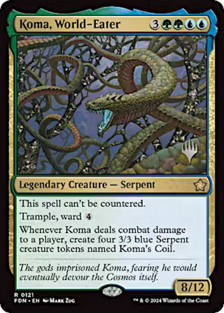 Koma, World-EaterCasting Cost: Card Type: Legendary Creature - SerpentPower/Toughness: 8/12Card Text: This spell can't be countered. Trample, ward Whenever Koma deals combat damage to a player, create four 3/3 blue Serpent creature tokens named Koma's Coil.Flavour Text: The gods imprisoned Koma, fearing he would eventually devour the Cosmos itself.Artist: Mark Zug