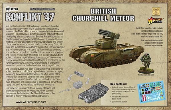 In a bid to utilise more Rift-technology in enhanced combat power, a relatively minor line of development inadvertently spawned the Meteor Rocket and subsequently its tank-mounted launcher. The discovery of a metal degrading enzyme that could rapidly degrade armour plate led Britain’s Rift-tech scientists to develop a ceramic-tipped rocket that could be launched from a multiple launcher against heavily armoured targets.