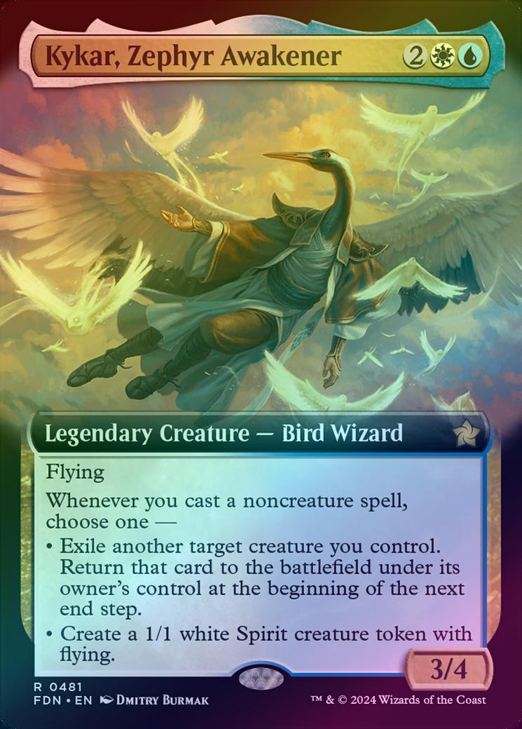 Kykar, Zephyr AwakenerCasting Cost: Card Type: Legendary Creature - Bird WizardPower/Toughness: 3/4Card Text: Flying Whenever you cast a noncreature spell, choose one - - Exile another target creature you control. Return it to the battlefield under its owner's control at the beginning of the end step. - Create a 1/1 white Spirit creature token with flying.Artist: Dmitry Burmak