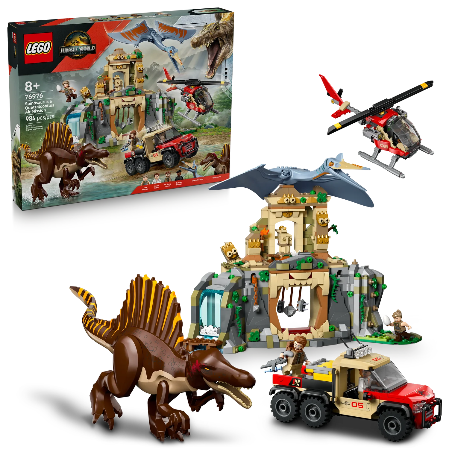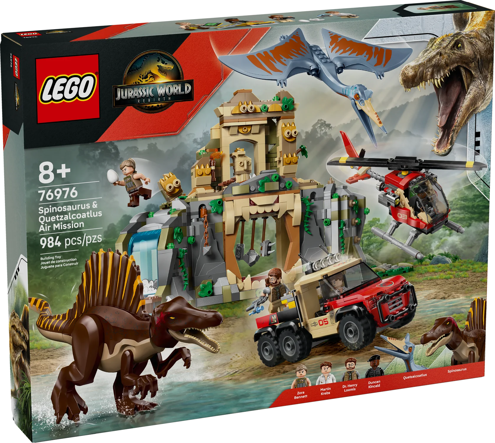 - Jurassic World Rebirth toys in a LEGO® box – Molded Spinosaurus and Quetzalcoatlus figures, 4 movie character minifigures, an ancient temple, a toy helicopter and dinosaur truck toy, plus lots of details