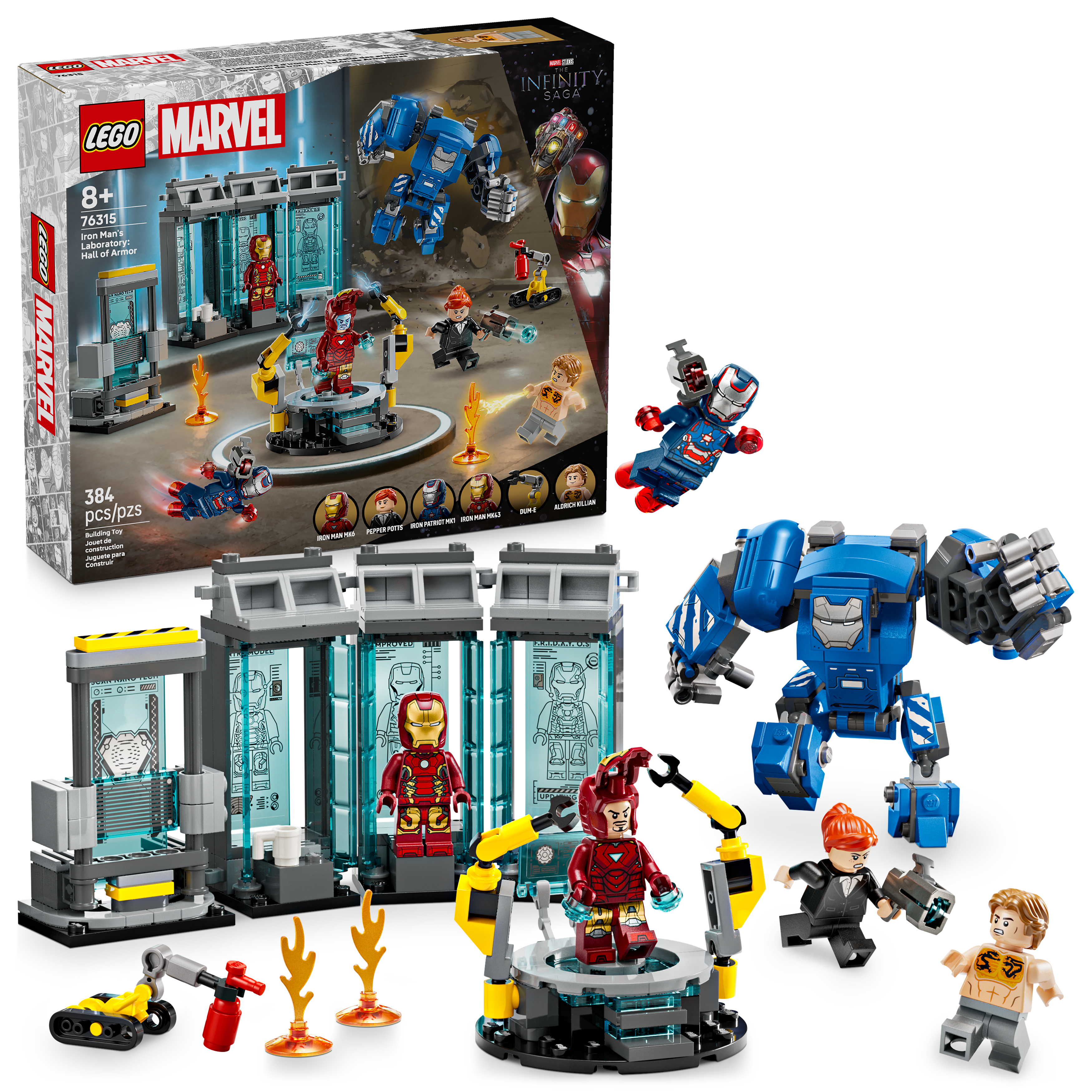 - Super Hero characters – Iron Patriot, MK43 and MK6 Iron Man armor, Pepper Potts and AldrichKillian minifigures, a buildable Dum-E robot and an MK3 mech with movable arms and legs and an opening cockpit