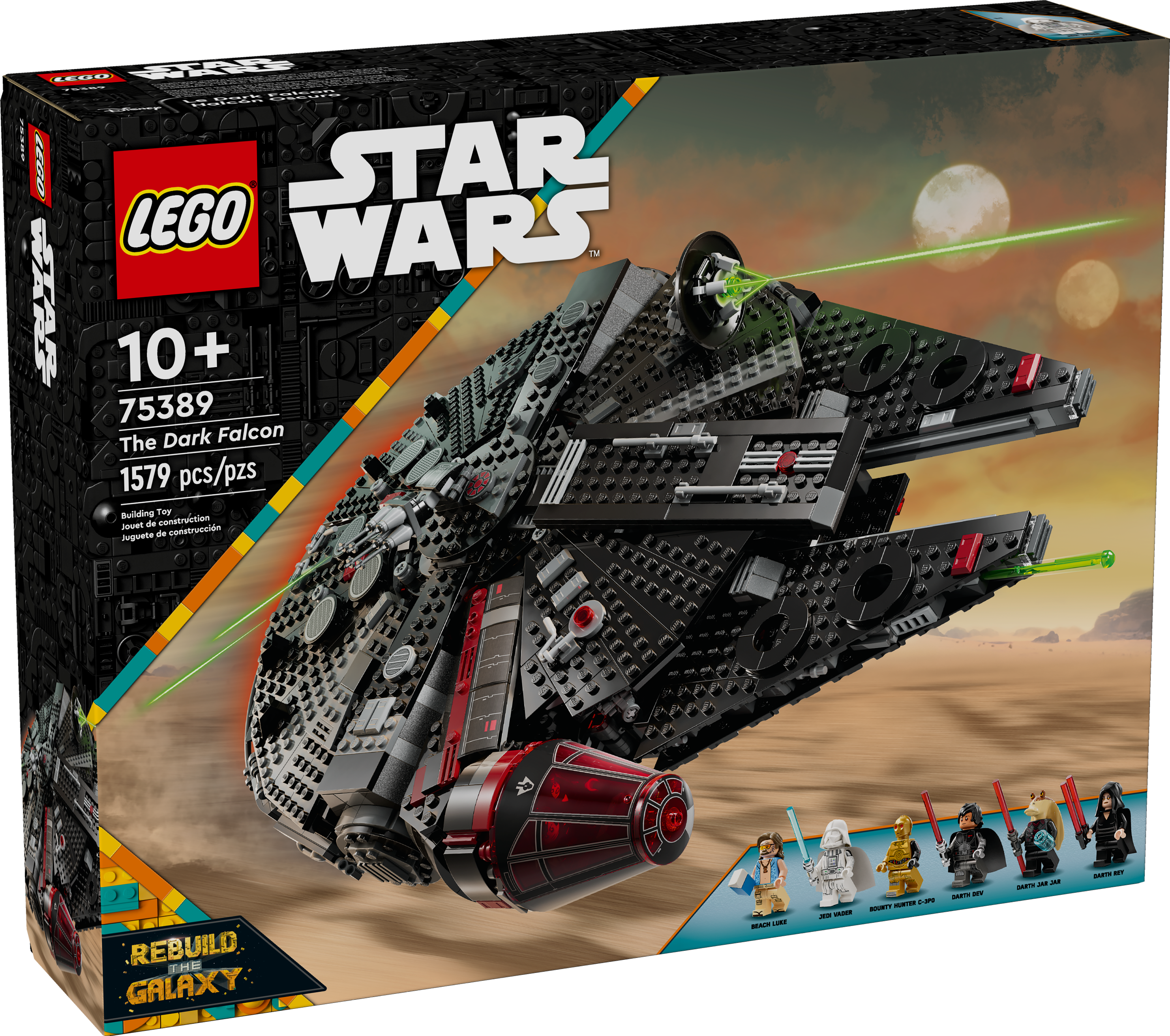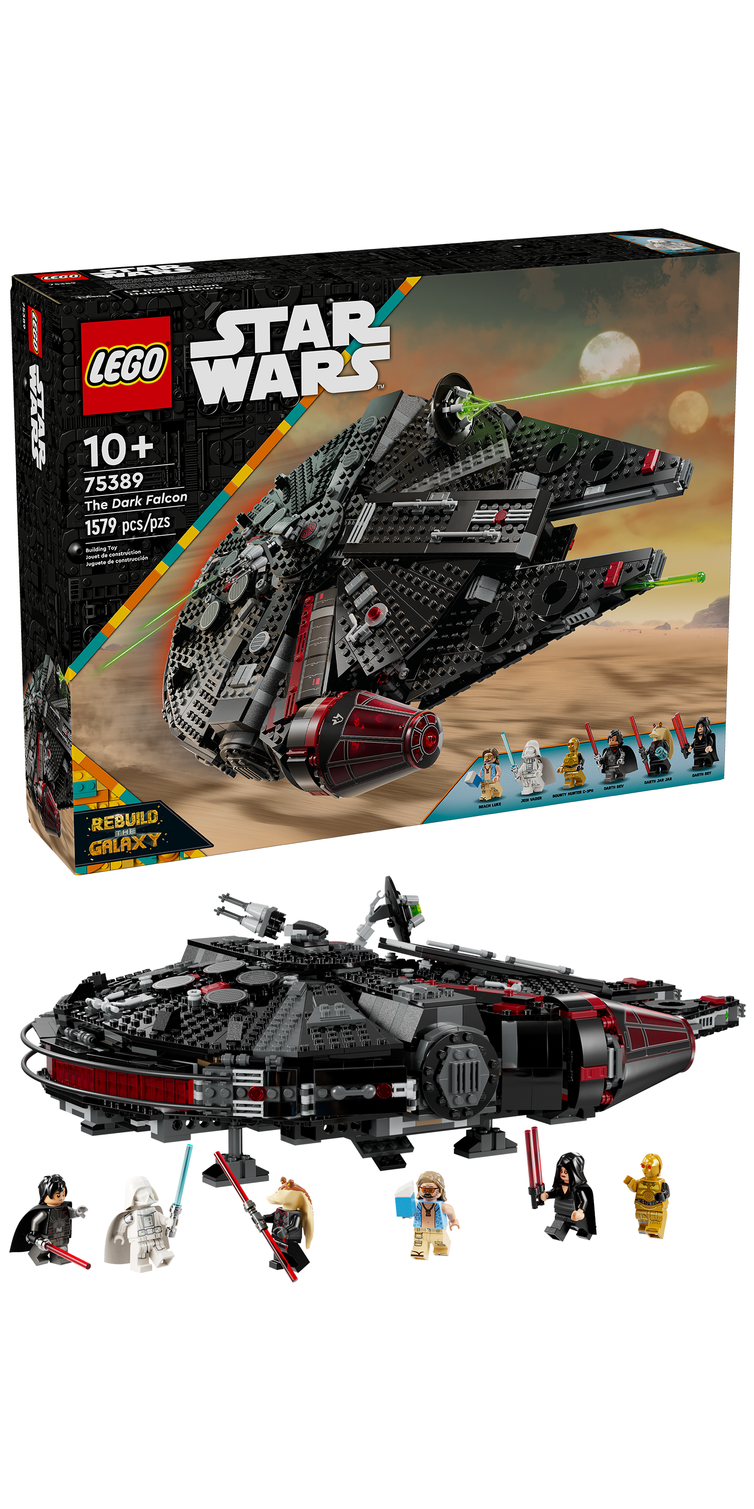 - LEGO® Star Wars™ buildable toy vehicle set for kids – Build The Dark Falcon, a dark version of the Millennium Falcon as seen in the Rebuild the Galaxy Disney+ special, to turn the universe upside down