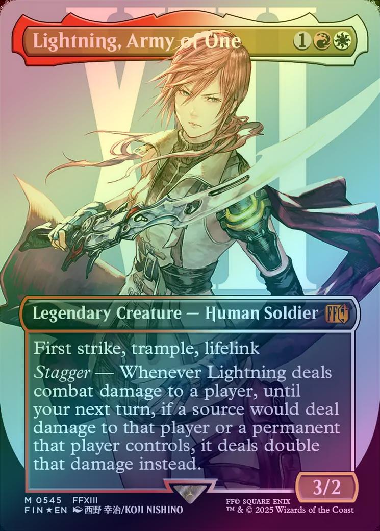 Lightning, Army of OneCasting Cost: Card Type: Legendary Creature - Human SoldierPower/Toughness: 3/2Card Text: First strike, trample, lifelink Stagger - Whenever Lightning deals combat damage to a player, until your next turn, if a source would deal damage to that player or a permanent that player controls, it deals double that damage instead.Artist: Koji Nishino