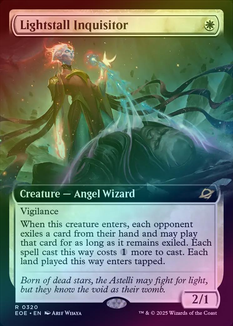 Lightstall InquisitorCasting Cost: Card Type: Creature - Angel WizardPower/Toughness: 2/1Card Text: Vigilance When this creature enters, each opponent exiles a card from their hand and may play that card for as long as it remains exiled. Each spell cast this way costs more to cast. Each land played this way enters tapped.Flavour Text: Born of dead stars, the Astelli may fight for light, but they know the void as their womb.Artist: Arif Wijaya