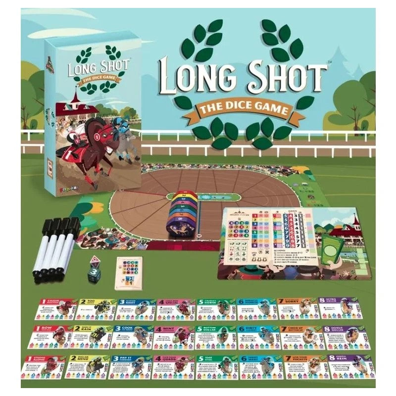 In Long Shot: The Dice Game, you and up to seven other players will strategize and push your luck as the action unfolds in a tense race of eight horses. During the game you buy horses, place bets, influence race movement, and utilize special abilities. The roll of the dice determines which horses move and the options available each turn, so be ready to adapt your plans. Once three horses cross the finish line, earnings are totaled. While there are many ways to earn money during a horse race, only the player that makes the most money will be declared the winner. Will you play it safe, or risk it big on a long shot?
