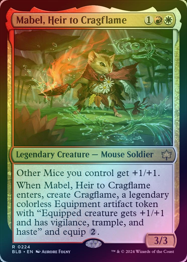Mabel, Heir to CragflameCasting Cost: Card Type: Legendary Creature - Mouse SoldierPower/Toughness: 3/3Card Text: Other Mice you control get +1/+1. When Mabel, Heir to Cragflame enters, create Cragflame, a legendary colorless Equipment artifact token with "Equipped creature gets +1/+1 and has vigilance, trample, and haste" and equip .Artist: Aurore Folny