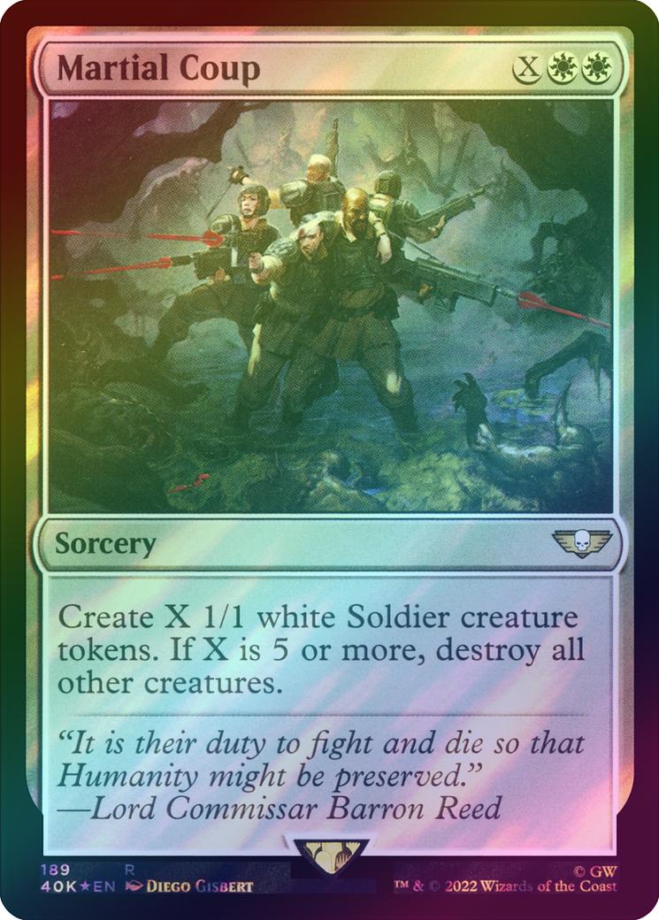 Martial CoupCasting Cost: Card Type: SorceryCard Text: Create X 1/1 white Soldier creature tokens. If X is 5 or more, destroy all other creatures.Flavour Text: "It is their duty to fight and die so that Humanity might be preserved." -Lord Commissar Barron ReedArtist: Diego Gisbert