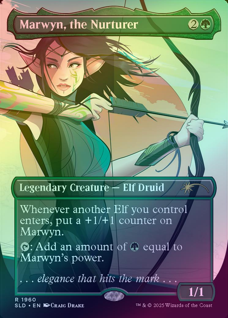 Marwyn, the NurturerCasting Cost: Card Type: Legendary Creature - Elf DruidPower/Toughness: 1/1Card Text: Whenever another Elf you control enters, put a +1/+1 counter on Marwyn. : Add an amount of equal to Marwyn's power.Flavour Text: ...elegance that hits the mark...Artist: Craig Drake