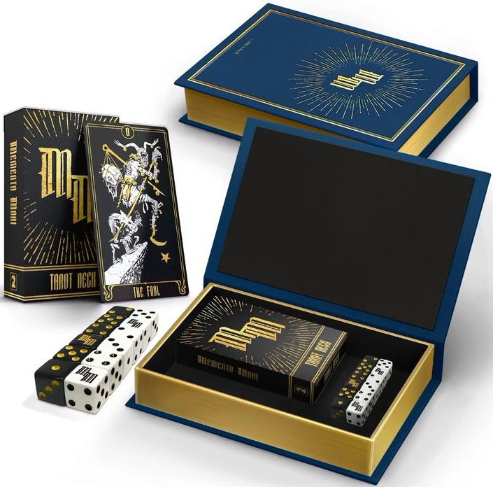 This box holds the most precious materials from this edition of Memento Mori. The Tarot deck and the custom-made dice, as well as 6 printed Binding Pacts and the Blades of Ruin bookmarks.