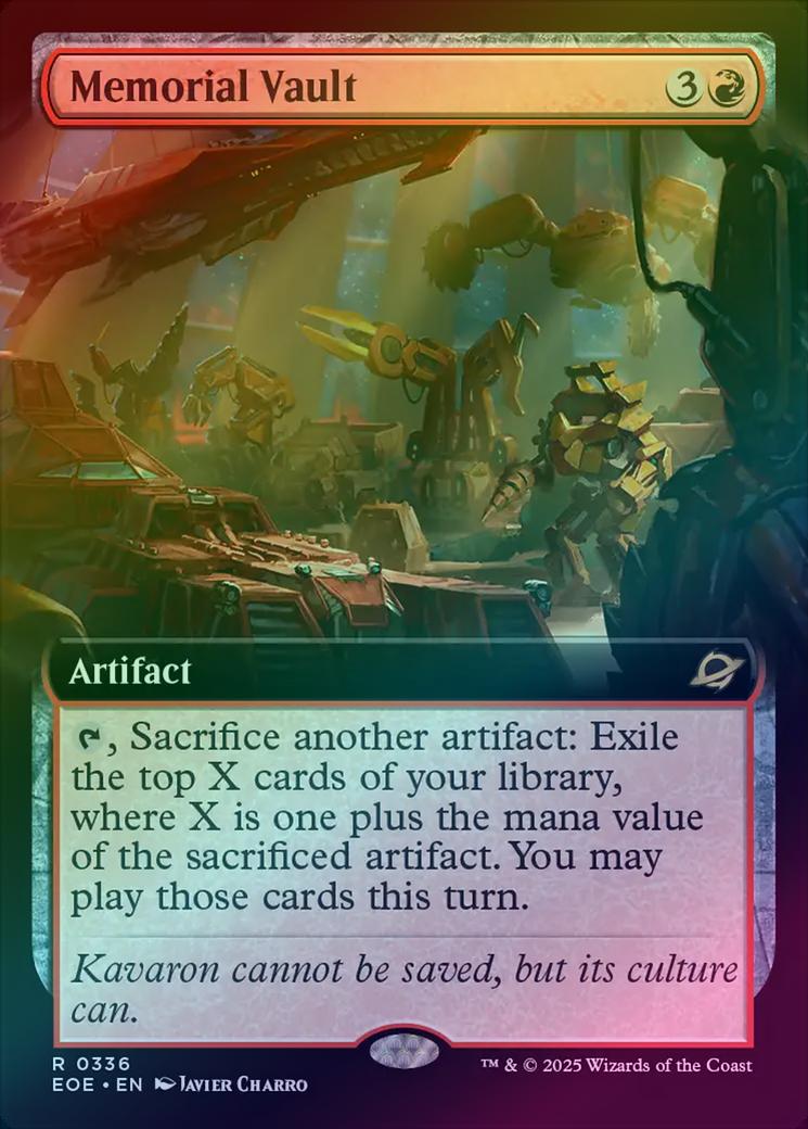 Memorial VaultCasting Cost: Card Type: ArtifactCard Text: , Sacrifice another artifact: Exile the top X cards of your library, where X is one plus the mana value of the sacrificed artifact. You may play those cards this turn.Flavour Text: Kavaron cannot be saved, but its culture can.Artist: Javier Charro