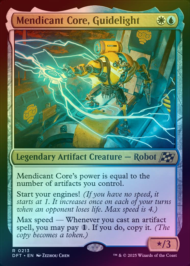 Mendicant Core, GuidelightCasting Cost: Card Type: Legendary Artifact Creature - RobotPower/Toughness: */3Card Text: Mendicant Core's power is equal to the number of artifacts you control. Start your engines! (If you have no speed, it starts at 1. It increases once on each of your turns when an opponent loses life. Max speed is 4.) Max speed - Whenever you cast an artifact spell, you may pay . If you do, copy it. (The copy becomes a token.)Artist: Zezhou Chen