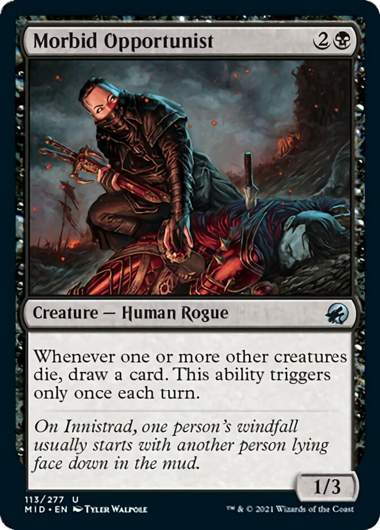 Morbid OpportunistCasting Cost: Card Type: Creature - Human RoguePower/Toughness: 1/3Card Text: Whenever one or more other creatures die, draw a card. This ability triggers only once each turn.Flavour Text: On Innistrad, one person's windfall usually starts with another person lying face down in the mud.Artist: Tyler Walpole