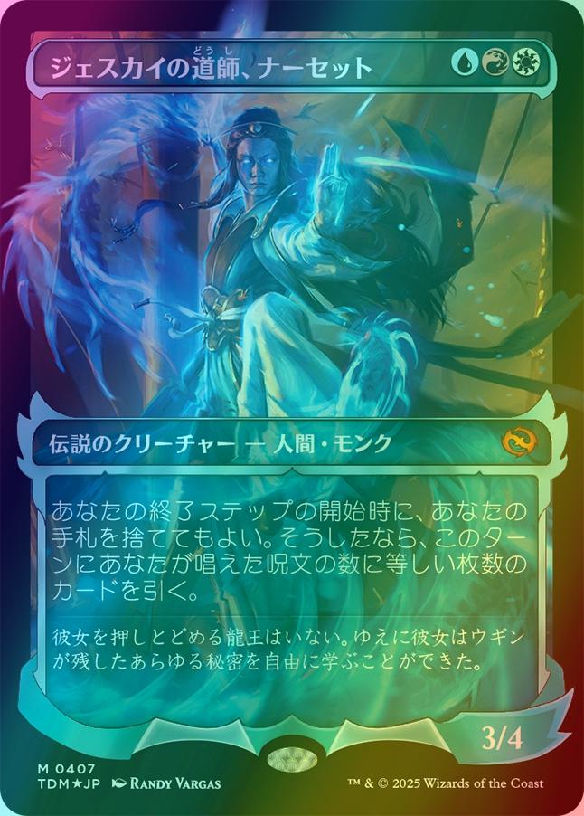 Narset, Jeskai WaymasterCasting Cost: Card Type: Legendary Creature - Human MonkPower/Toughness: 3/4Card Text: At the beginning of your end step, you may discard your hand. If you do, draw cards equal to the number of spells you've cast this turn.Flavour Text: With no dragonlord to hold her back, she was free to learn every secret Ugin left behind.Artist: Randy Vargas