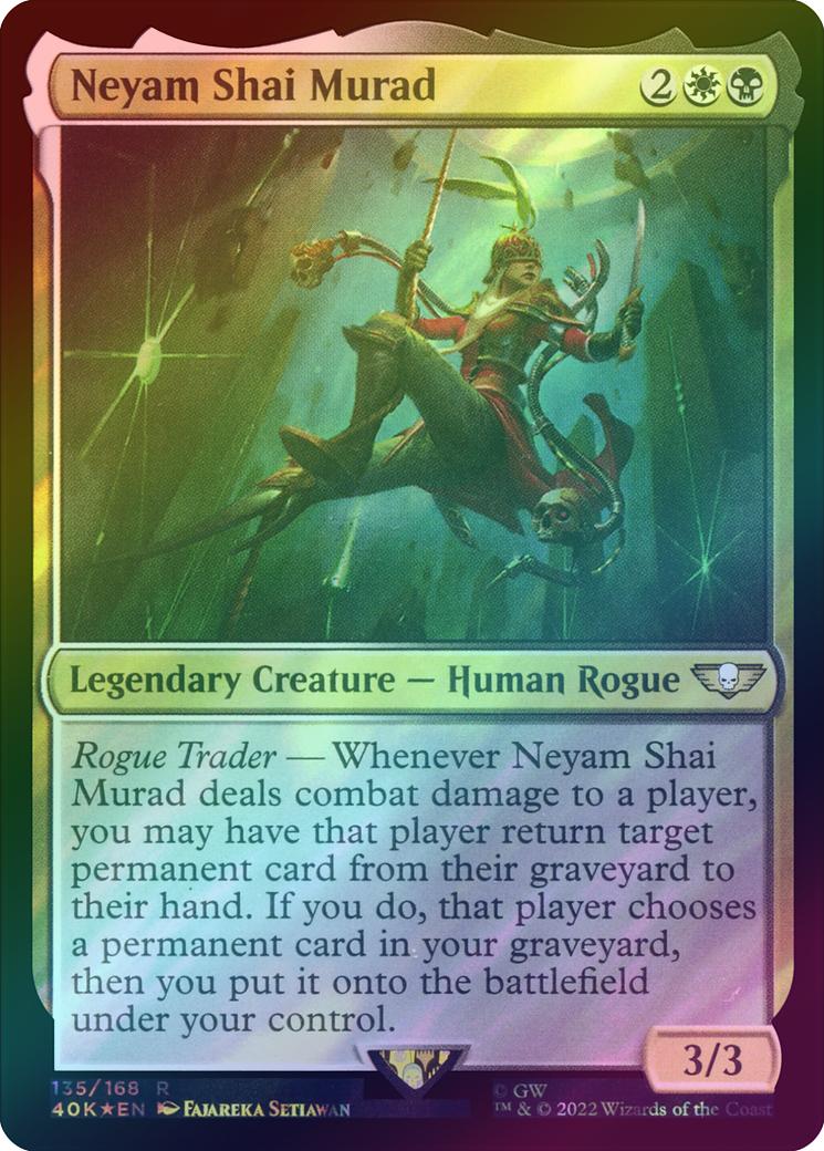 Neyam Shai MuradCasting Cost: Card Type: Legendary Creature - Human RoguePower/Toughness: 3/3Card Text: Rogue Trader - Whenever Neyam Shai Murad deals combat damage to a player, you may have that player return target permanent card from their graveyard to their hand. If you do, that player chooses a permanent card in your graveyard, then you put it onto the battlefield under your control.Artist: Fajareka Setiawan