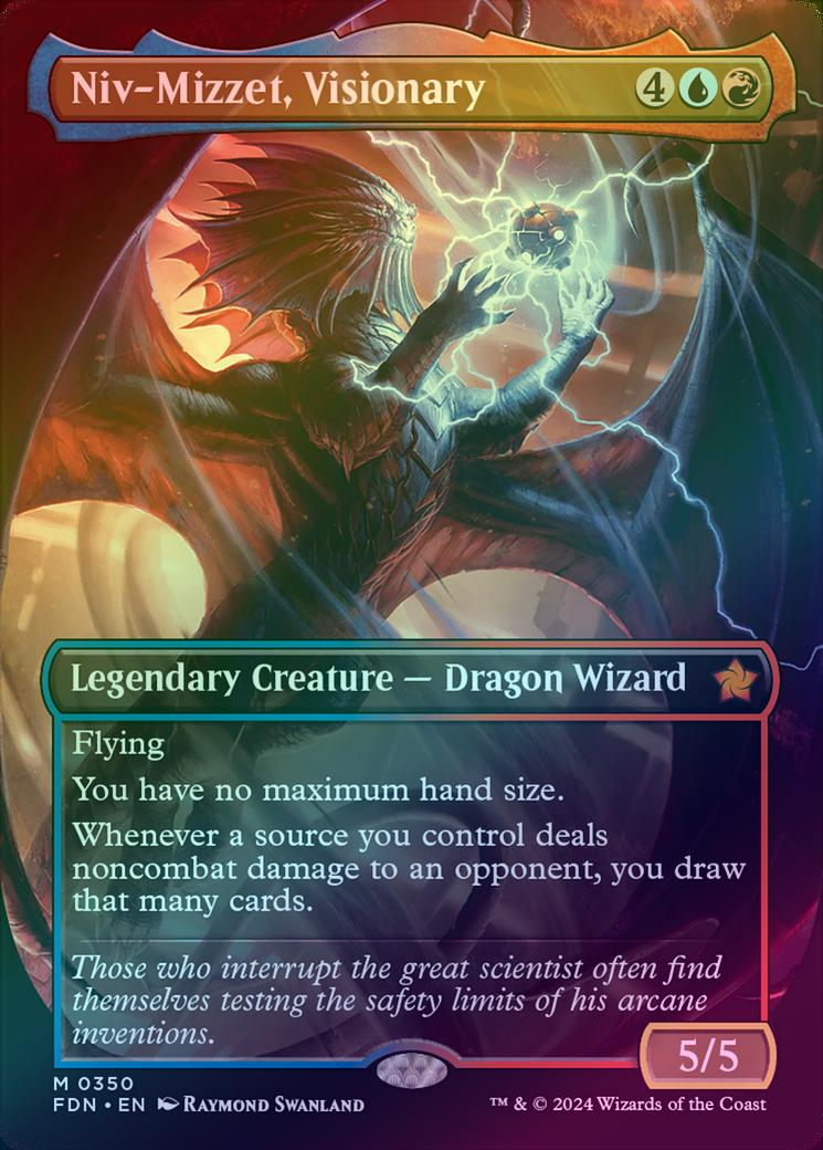 Niv-Mizzet, VisionaryCasting Cost: Card Type: Legendary Creature - Dragon WizardPower/Toughness: 5/5Card Text: Flying You have no maximum hand size. Whenever a source you control deals noncombat damage to an opponent, you draw that many cards.Flavour Text: Those who interrupt the great scientist often find themselves testing the safety limits of his arcane inventions.Artist: Raymond Swanland