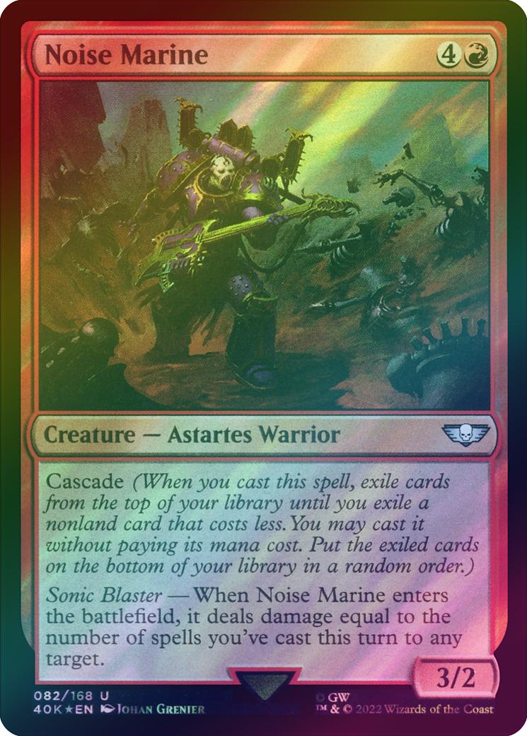 Noise MarineCasting Cost: Card Type: Creature - Astartes WarriorPower/Toughness: 3/2Card Text: Cascade (When you cast this spell, exile cards from the top of your library until you exile a nonland card that costs less. You may cast it without paying its mana cost. Put the exiled cards on the bottom in a random order.) Sonic Blaster - When this creature enters, it deals damage equal to the number of spells you've cast this turn to any target.Artist: Johan Grenier