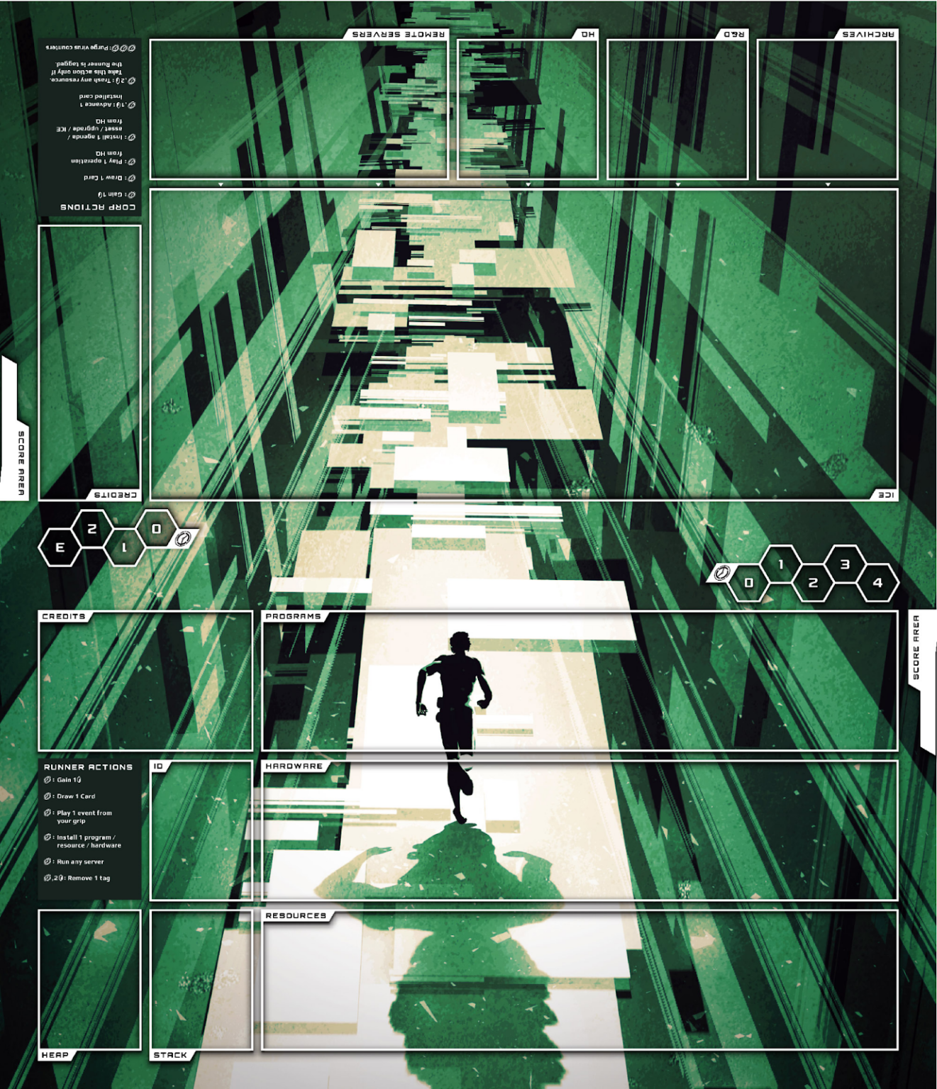 The playmat features the gorgeous card art from Envelopment by Scott Uminga overlaid with Corp and Runner specific sections and a central click tracking area. The neoprene playmat allows players new and seasoned to organize their field of play for both cards, tokens and clicks as well as providing each with a handy list of standard actions.