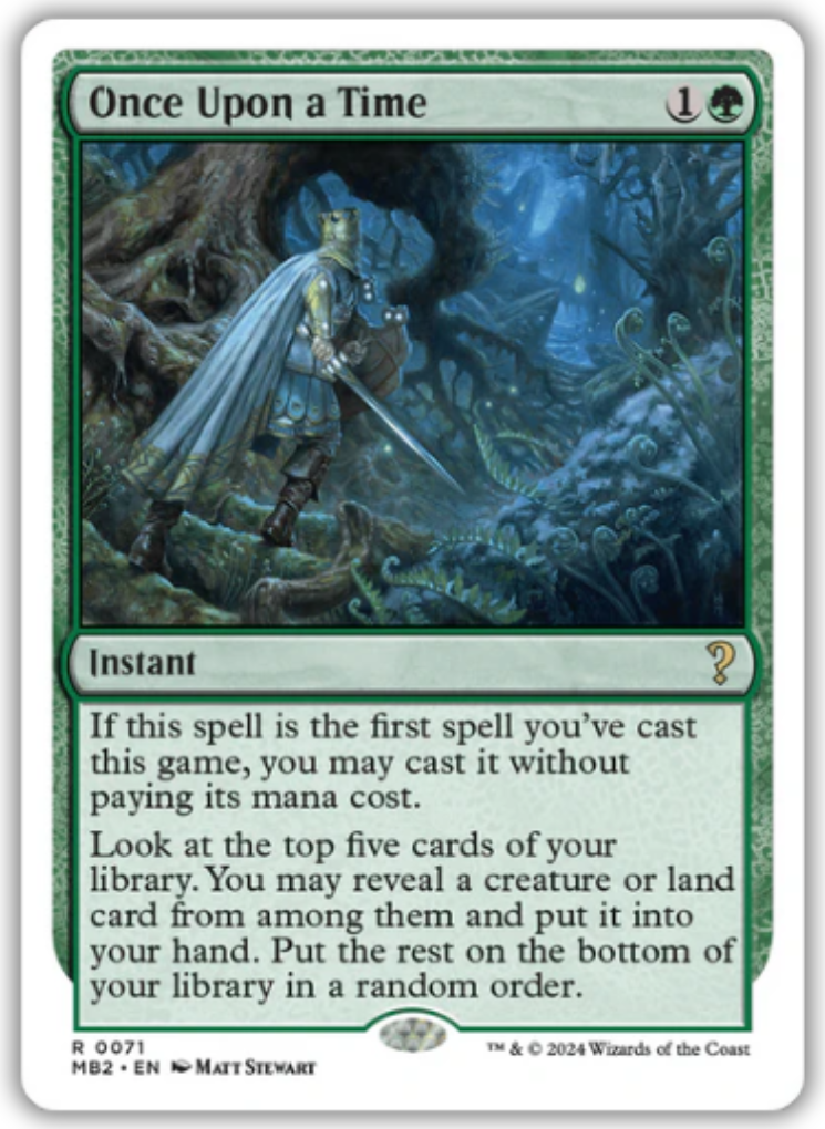 Once Upon a TimeCasting Cost: Card Type: InstantCard Text: If this spell is the first spell you've cast this game, you may cast it without paying its mana cost. Look at the top five cards of your library. You may reveal a creature or land card from among them and put it into your hand. Put the rest on the bottom of your library in a random order.Artist: Matt Stewart