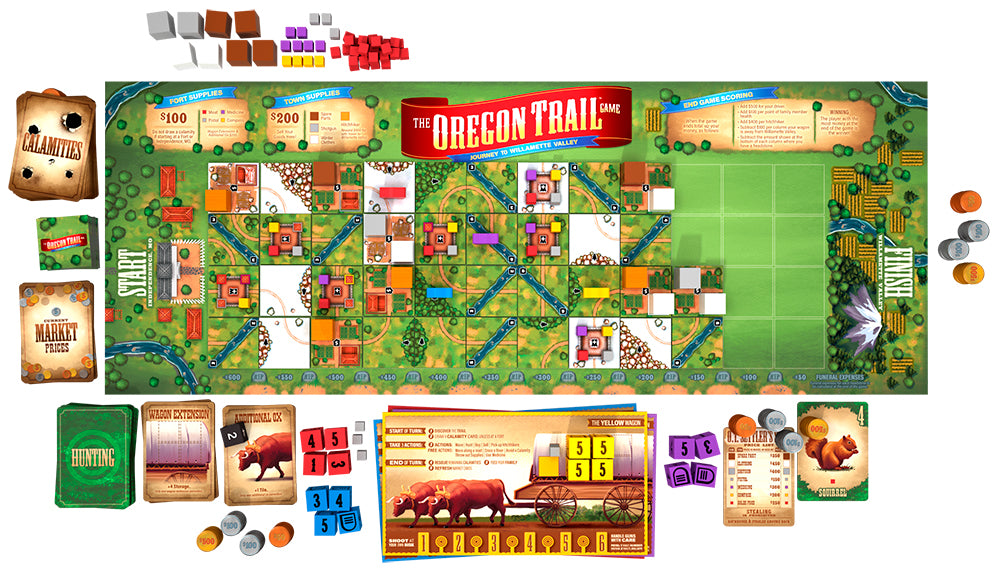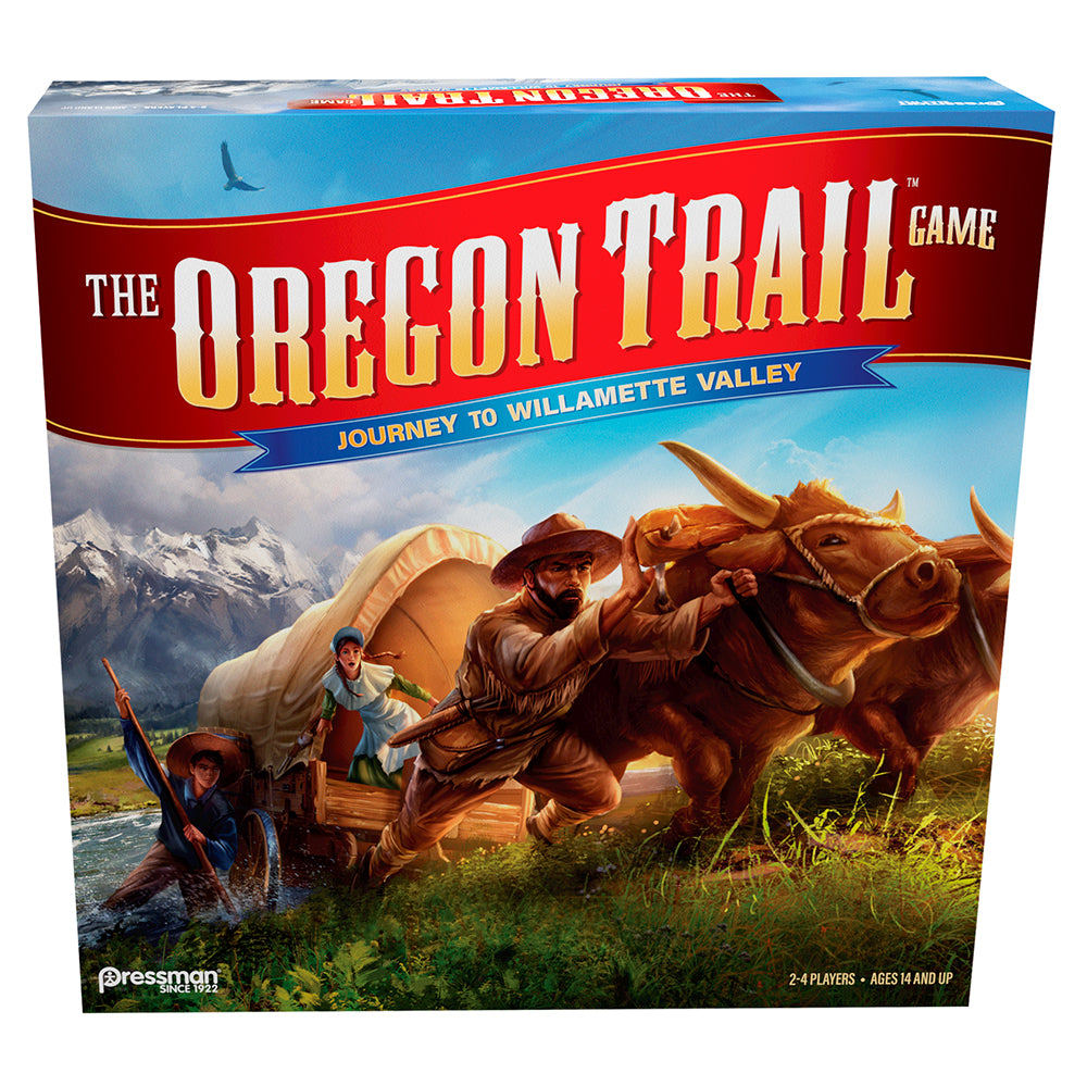 It's 1844: You and your family have joined a wagon train in Independence, MO that is about to head to Willamette Valley to find your fortune in the West! Players will place tiles to discover the trails, rivers, forts, and towns ahead of them that they will move through to this new land. This scenic journey would almost be perfect... if it wasn't for the disease, drowning, rattlesnakes and other hazards that will plague you along the way. You'll need to hunt for food to avoid starvation, and with limited wagon space, you may need to choose between supplies and family members to keep moving along the trail. Until, eventually, you find yourself safe, in Willamette Valley. Relive your fond memories of one of the world’s most beloved computer games as you race your friends to victory in ''The Oregon Trail: Journey to Willamette Valley.''