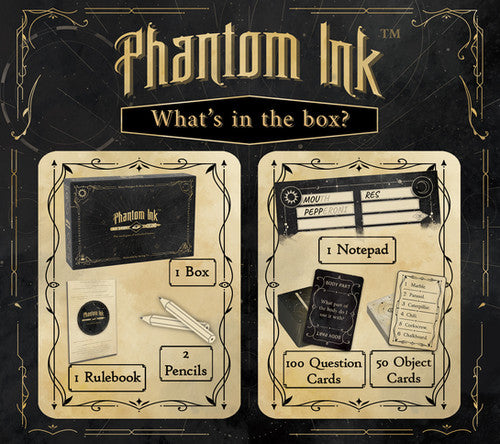 To set up Phantom Ink, divide players so that the Sun team and the Moon team each have one Spirit and up to three Mediums. The mediums on a team share a hand of seven question cards, and the spirits begin the game by choosing one of the five objects on a card as the secret object. On a turn, the mediums pass two question cards to their spirit, with sample questions like "What color is it most commonly?", "What fictional character has it or uses it?", and "If it were a musical instrument, what would it be?"