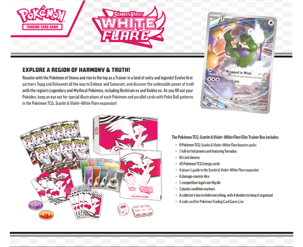 Reunite with the Pokémon of Unova and rise to the top as a Trainer in a land of unity and legends! Evolve first partners Tepig and Oshawott all the way to Emboar and Samurott, and discover the undeniable power of truth with the region’s Legendary and Mythical Pokémon, including Reshiram ex and Keldeo ex. As you fill out your Pokédex, keep an eye out for special illustrations of each Pokémon and parallel cards with Poké Ball patterns in the Pokémon TCG: Scarlet & Violet—White Flare expansion!