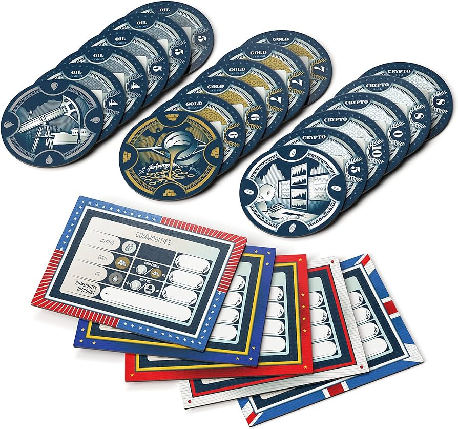 Q.E. Commodities now presents new investment opportunities for each country! As an expansion to Q.E., you will now have the ability to diversify your portfolio by investing in gold, oil, and crypto. Each commodity adds additional variable victory points to bolster your score. The biggest element of the expansion however is that it now enables you to lower your total spend throughout the game, providing extra layers of strategy and unexpected twists!