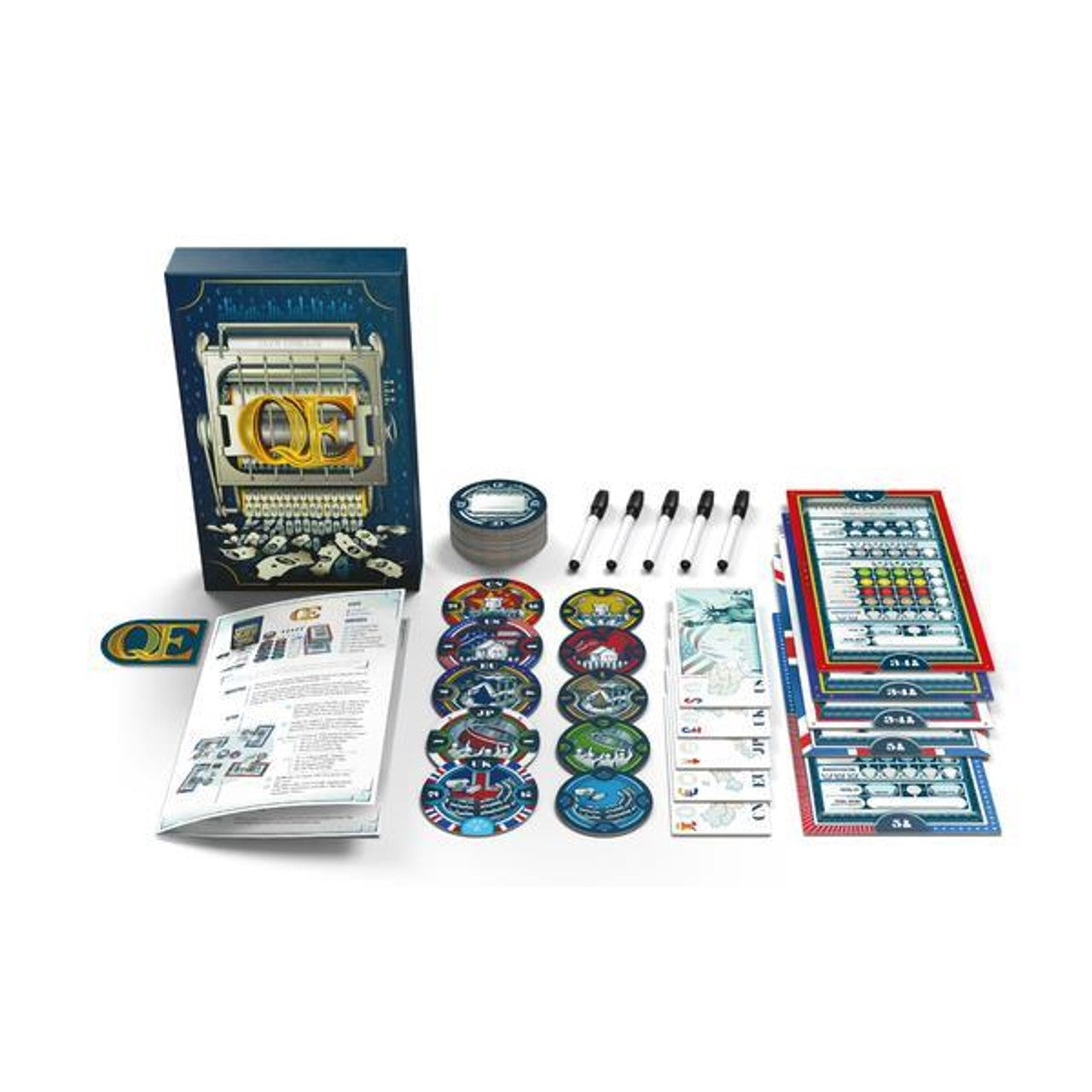 In Q.E., a term that stands for "quantitative easing", you play the role of a central bank. You bid on different size companies to accumulate various levels of victory points. The amount you bid is unlimited since you are the central bank and you own the printing press! After the initial "open" bid by the lead player, the other players bid in secret. After the sixteen companies have been "bailed out", bonus victory points are awarded for company sets of nationalization, monopolization, and diversification.
