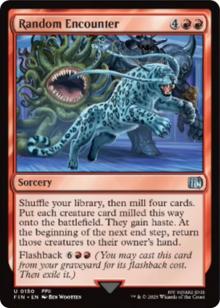 Random EncounterCasting Cost: Card Type: SorceryCard Text: Shuffle your library, then mill four cards. Put each creature card milled this way onto the battlefield. They gain haste. At the beginning of the next end step, return those creatures to their owner's hand. Flashback (You may cast this card from your graveyard for its flashback cost. Then exile it.)Artist: Ben Wootten