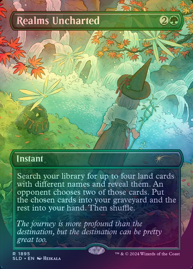 Realms UnchartedCasting Cost: Card Type: InstantCard Text: Search your library for up to four land cards with different names and reveal them. An opponent chooses two of those cards. Put the chosen cards into your graveyard and the rest into your hand. Then shuffle.Flavour Text: The journey is more profound than the destination, but the destination can be pretty great too.Artist: Heikala