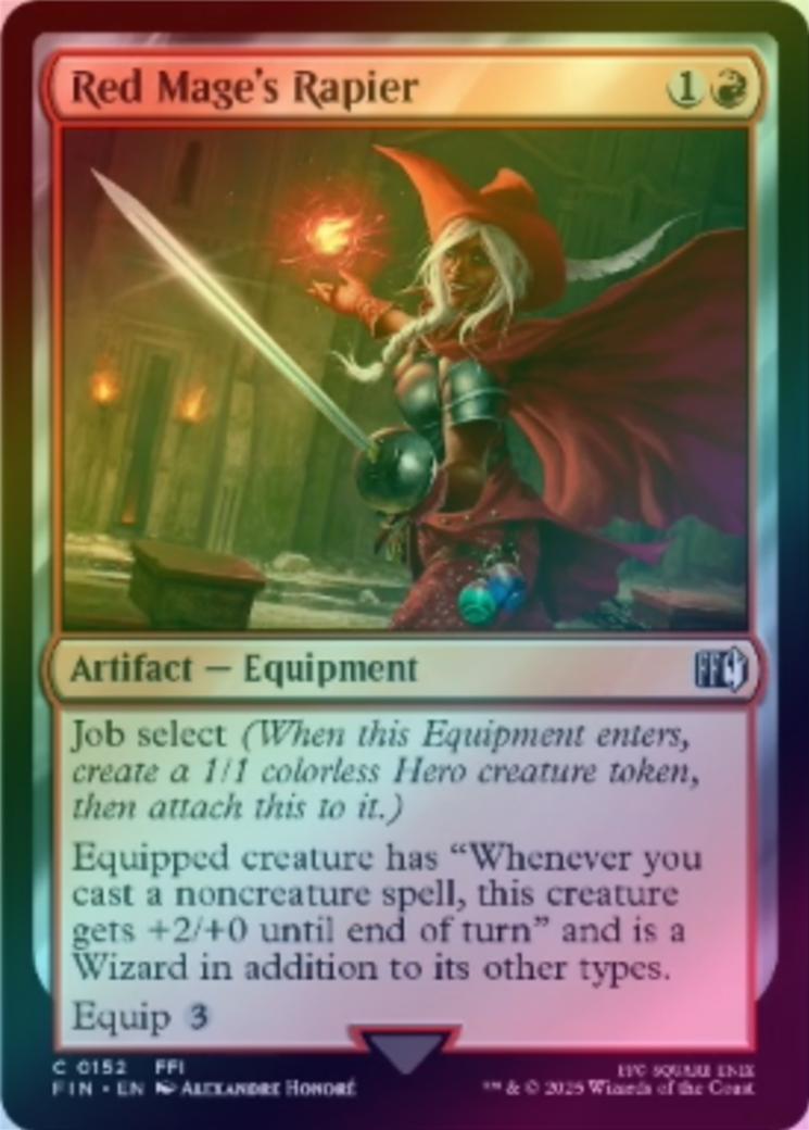 Red Mage's RapierCasting Cost: Card Type: Artifact - EquipmentCard Text: Job select (When this Equipment enters, create a 1/1 colorless Hero creature token, then attach this to it.) Equipped creature has "Whenever you cast a noncreature spell, this creature gets +2/+0 until end of turn" and is a Wizard in addition to its other types. Equip Artist: Alexandre Honor