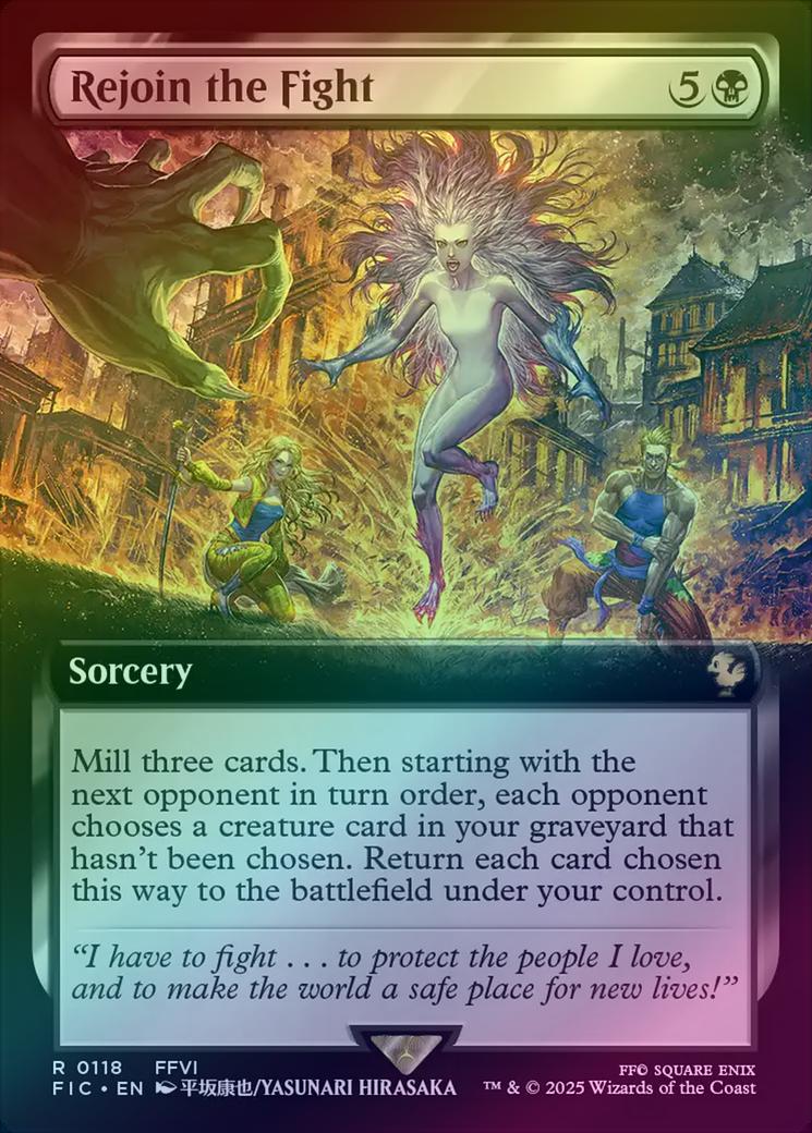 Rejoin the FightCasting Cost: Card Type: SorceryCard Text: Mill three cards. Then starting with the next opponent in turn order, each opponent chooses a creature card in your graveyard that hasn't been chosen. Return each card chosen this way to the battlefield under your control.Flavour Text: "I have to fight... to protect the people I love, and to make the world a safe place for new lives!"Artist: YASUNARI HIRASAKA