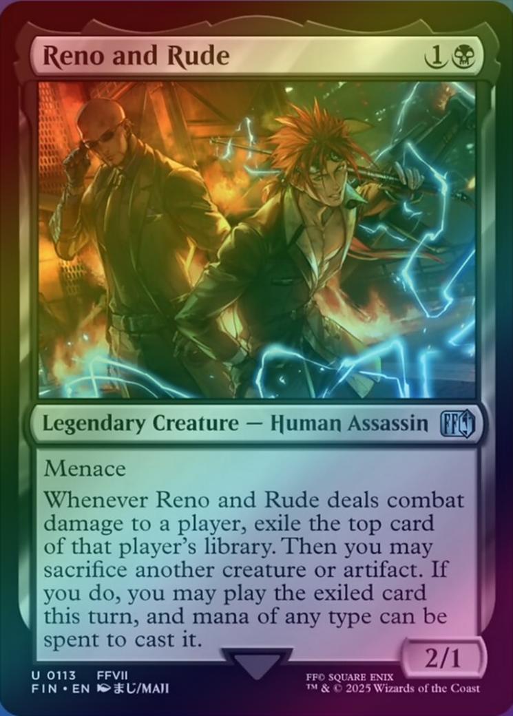 Reno and RudeCasting Cost: Card Type: Legendary Creature - Human AssassinPower/Toughness: 2/1Card Text: Menace Whenever Reno and Rude deals combat damage to a player, exile the top card of that player's library. Then you may sacrifice another creature or artifact. If you do, you may play the exiled card this turn, and mana of any type can be spent to cast it.Artist: Maji