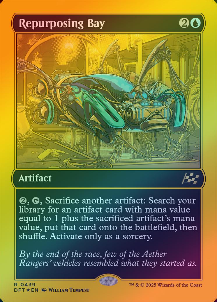 Repurposing BayCasting Cost: Card Type: ArtifactCard Text: , , Sacrifice another artifact: Search your library for an artifact card with mana value equal to 1 plus the sacrificed artifact's mana value, put that card onto the battlefield, then shuffle. Activate only as a sorcery.Flavour Text: By the end of the race, few of the Aether Rangers' vehicles resembled what they started as.Artist: William Tempest