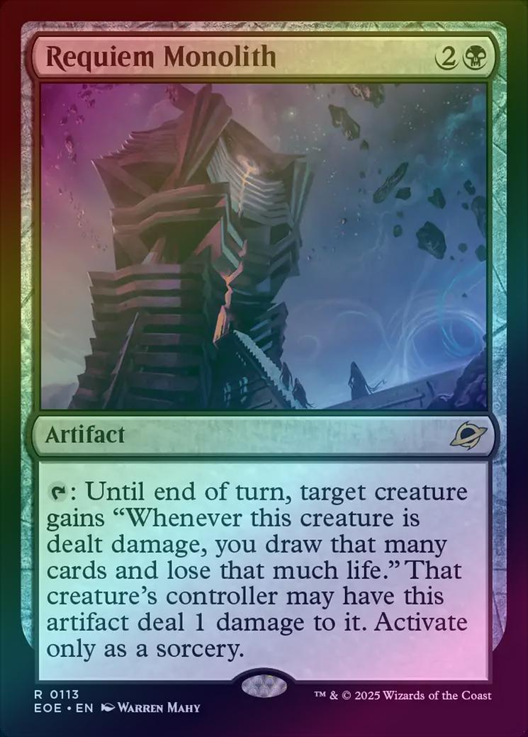 Requiem MonolithCasting Cost: Card Type: ArtifactCard Text: : Until end of turn, target creature gains "Whenever this creature is dealt damage, you draw that many cards and lose that much life." That creature's controller may have this artifact deal 1 damage to it. Activate only as a sorcery.Artist: Warren Mahy